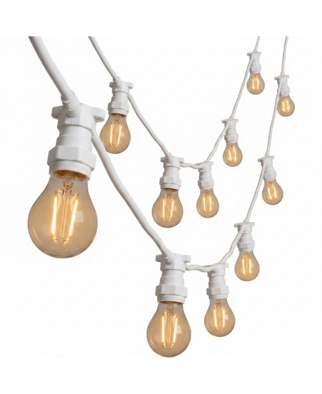 La Catenaria LED E27tutte le lampadine E27 con cavo bianco, lunga 10 metri, è perfetta per illuminare ambienti sia interni che esterni.