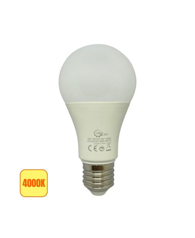 Lampadina LED E27tutte le lampadine E27 da 15W, diametro A65, luce naturale 4000K. Luminosità 1500 lm, angolo 220°, sistema di raffreddamento interno efficiente. Realizzata con materie prime non riciclate, tensione 220-240V, CRI 80.