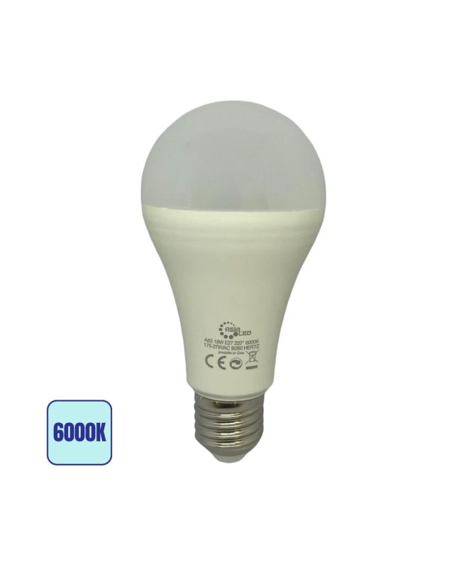 Lampadina LED E27tutte le lampadine E27 da 18W, diametro A65, luce fredda 6000K. Luminosità 1800 lm, angolo 220°, sistema di raffreddamento interno efficiente. Realizzata con materie prime non riciclate, tensione 175-265V, CRI 80.