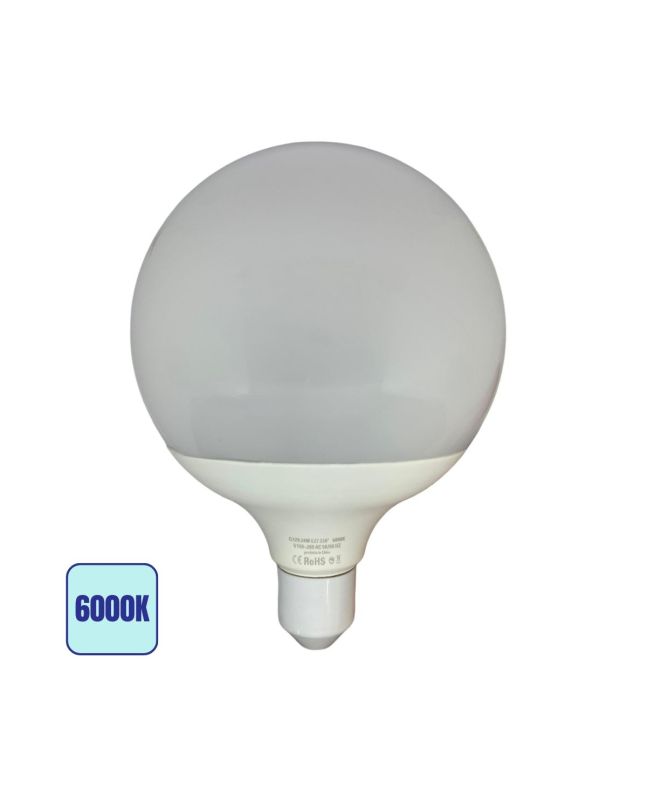 Lampadina LED E27tutte le lampadine E27 da 24W, diametro G120, luce fredda 6000K. Luminosità 2400 lm, angolo 220°, sistema di raffreddamento interno efficiente. Realizzata con materie prime non riciclate, tensione 160-265V, CRI 80.