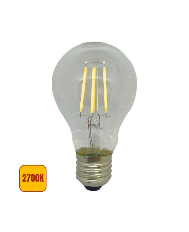 La Lampadina LED E27tutte le lampadine E27 a Filamento modello A60 è realizzata in vetro trasparente e offre una potenza di 5W con un'emissione luminosa di 650 Lumen (pari a 130 Lm/W).