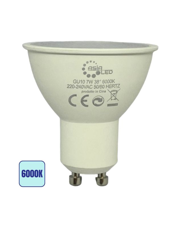 Lampadina LED GU10Lampadine GU 10 da 7W, spot 38°, luce fredda 6000K. Luminosità 700 lm, angolo 38°, sistema di raffreddamento interno efficiente. Realizzata con materie prime non riciclate, tensione 220-240V, CRI 80.