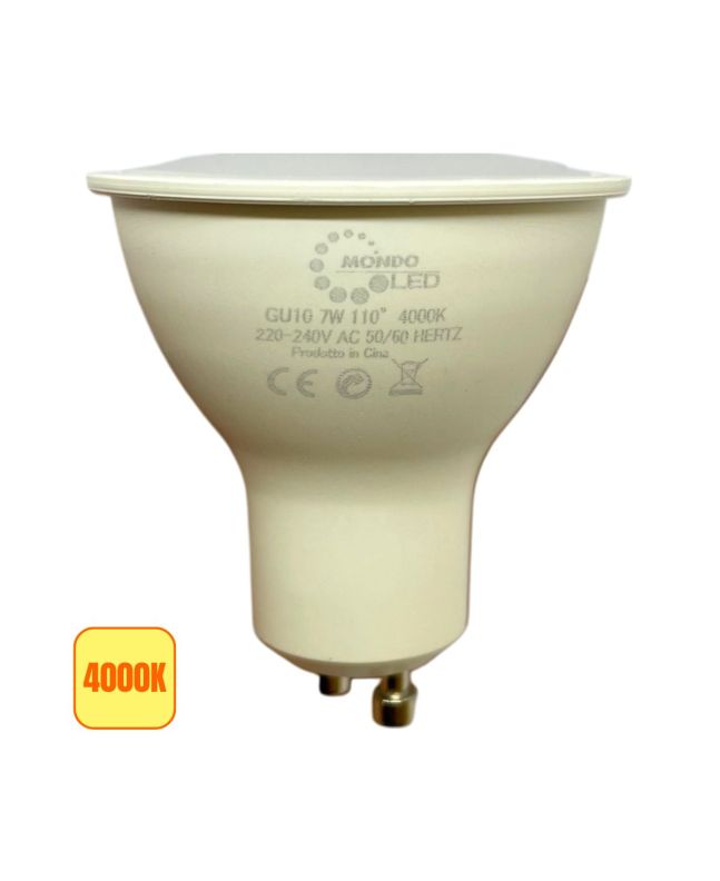 Lampadina LED GU10Lampadine GU 10 da 7W, spot opaca 110°, luce naturale 4000K. Luminosità 700 lm, angolo 110°, sistema di raffreddamento interno efficiente. Realizzata con materie prime non riciclate, tensione 220-240V, CRI 80.