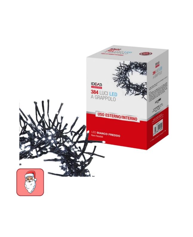 Acquista ora la catena a grappolo 384 LED Bianco Freddo IP44 AB.M Idea: pronta da installare, sicura e perfetta per decorazioni di grande impatto.