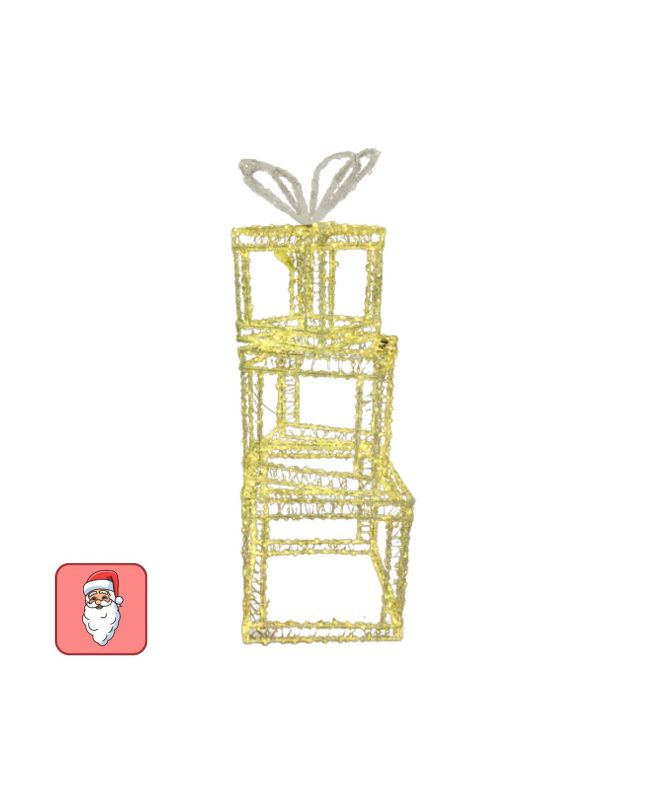 Pila di pacchi regalo luminosa alta 90 cm con 1200 LED Bianco Caldo e fiocco bianco. Decorazione scenografica natalizia per ambienti interni.