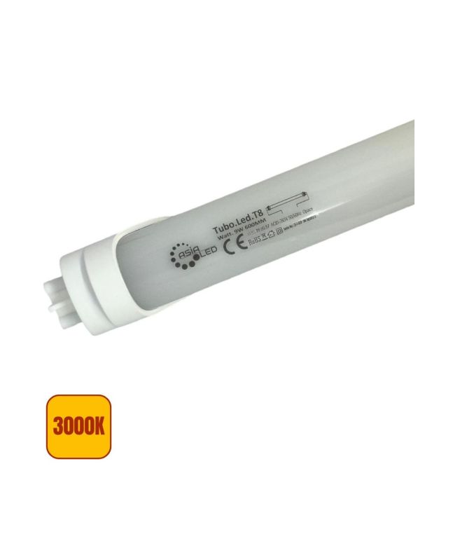Tubo LED T8 opaco da 9W con alimentazione bilaterale. Luce calda 3000K, lunghezza 60 cm, efficienza luminosa di 101 lm/W. Alta resa cromatica Ra 80, tensione 85-265V, PF >0,97.
